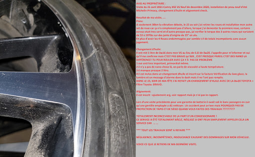 2 stars because the staff is nice, smiling and speaking good. I bought a used Toyota this week. It was agreed with the counselor as polishing had to be done to remove a scratch on the drivers side of the vehicle, and 4 winter tires in good condition should be provided and included in the contract. When I took delivery of the vehicles tires to the former owner who was in the trunk had not been removed (a chance that I looked) scratch was polished 3/4 remained part the rear wing that had not been made. It took me to be careful because the 4 winter tires which mention should be made of the contract was not (he must control the Ben wait to see ...). To scratching I went met the Director of Sales of used vehicles mentioned my dissatisfaction to him and he said politely remind my consultant to take appointments while taking a call on the cellular and talking minutes with another employee who was passing. He has not thought one minute that it could itself take my coordinated to transmit his advisor .... Etk they offer a free brake pad service life and oil change for $ 24.95 to my car, I certainly do not go there otherwise I would have to monitor the repair so they forget nothing. A philosophy and / or quality control training is greatly needed for these young guns who think only sale.